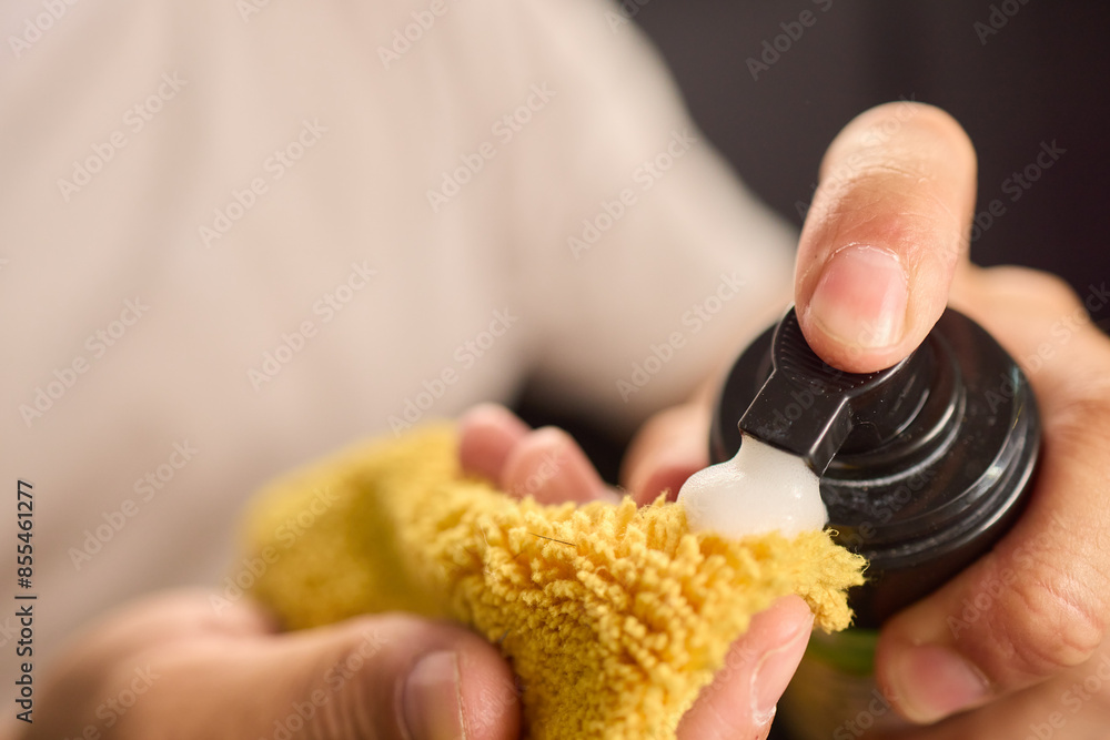 A man is cleaning the cars ceiling meticulously with a yellow cloth, focusing on detail