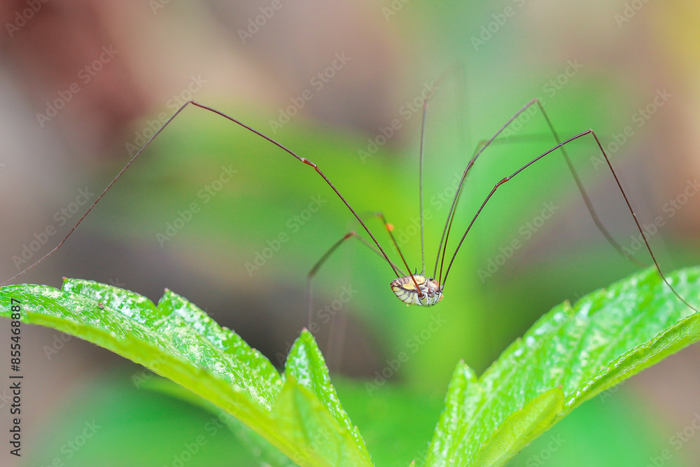 Strange and beautiful long-legged spider Walking on leaves in the tropical forests of Thailand