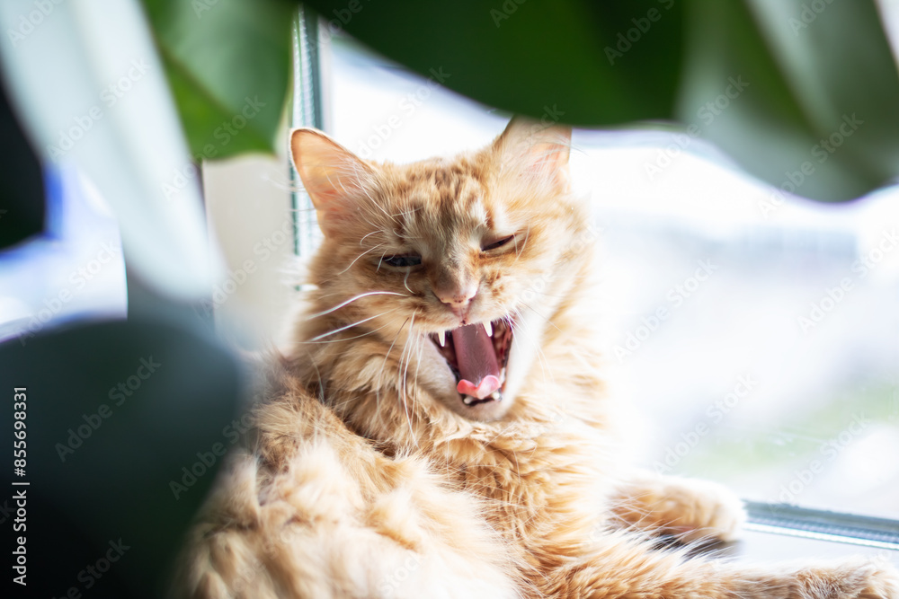 A cat is showing a gesture of tiredness by yawning on a window sill