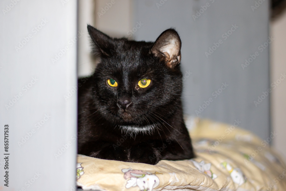 A black cat with yellow eyes is peacefully resting on top of a comfortable bed