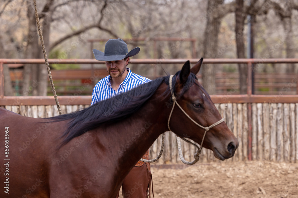 Cowboy horse trainer bay horse in round pen and using a rope and saddle