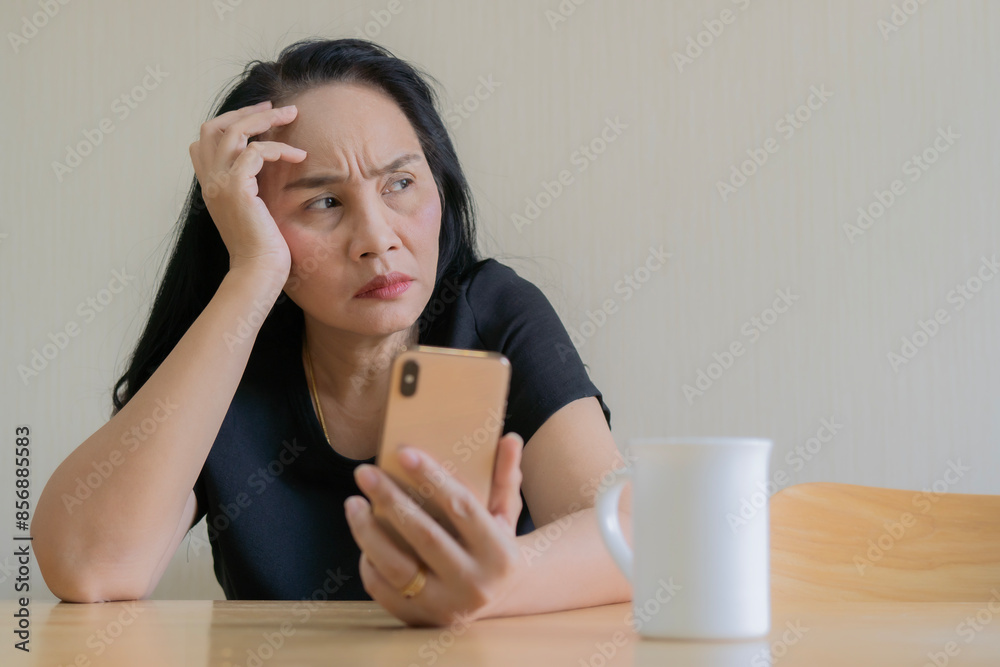 Waiting for his call. Depressed black hair woman looking at outside with sad face, sitting on couch at home