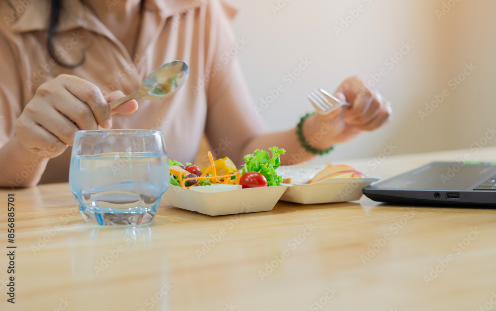 Woman sitting at office and using modern laptop while eating healthy salad.