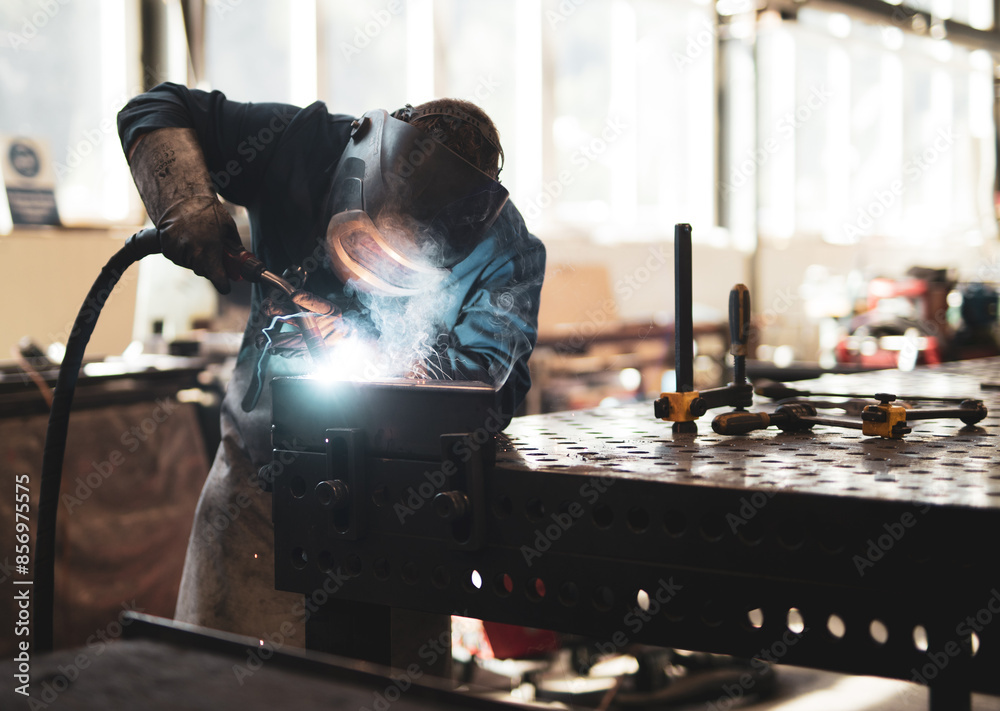 Arbeiter in Fabrik schweißt mit Funken und Rauch