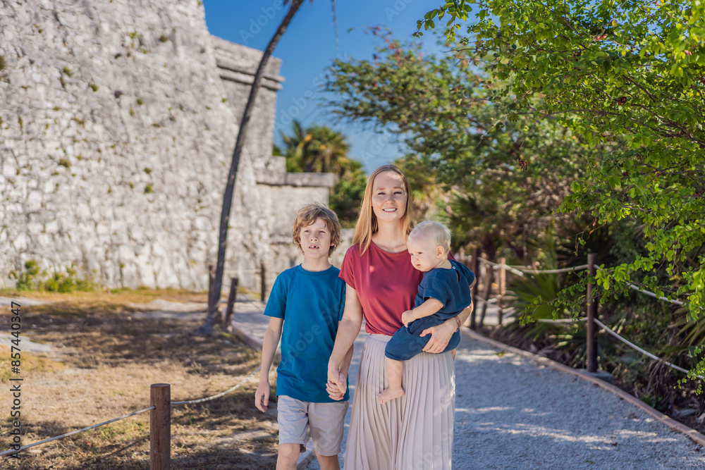 Mother and two sons tourists enjoying the view Pre-Columbian Mayan walled city of Tulum, Quintana Roo, Mexico, North America, Tulum, Mexico. El Castillo - castle the Mayan city of Tulum main temple