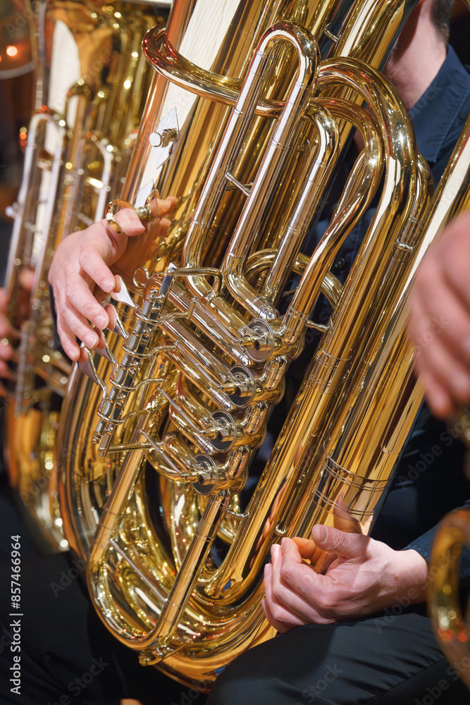 Hände, die eine glänzende Messingtuba spielen, Nahaufnahme der Finger des Musikers und der Ventile des Instruments.