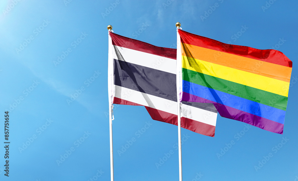 Thailand flag and rainbow flag on cloudy sky. fly in the sky