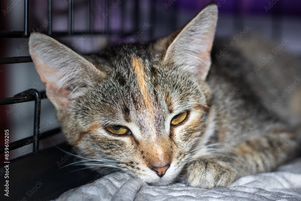A domestic shorthaired cat is peacefully resting on a blanket inside a cage