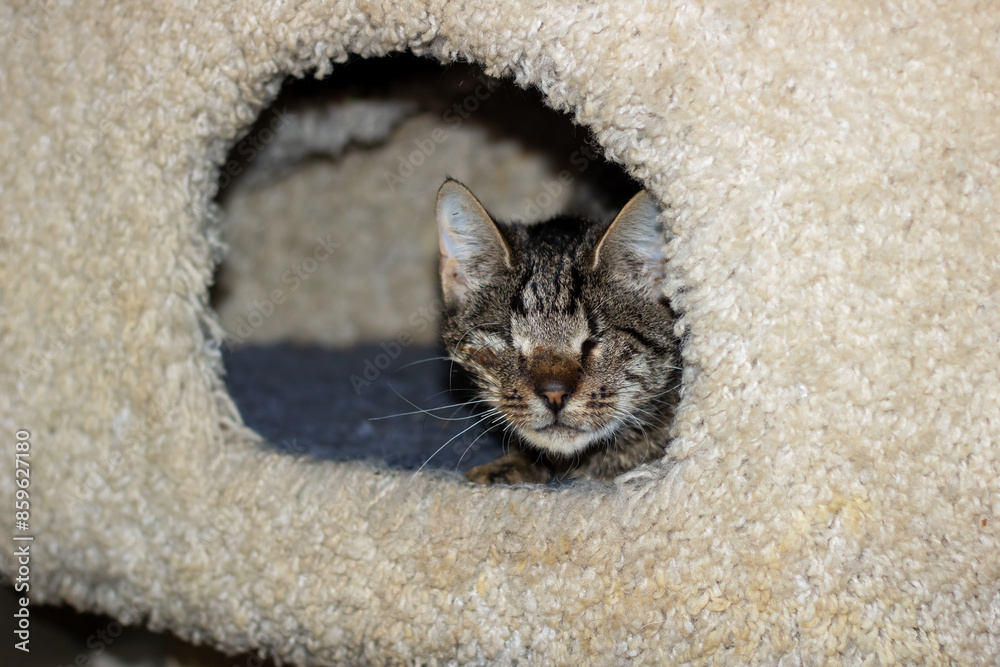 A Felidae carnivore with whiskers sleeps in a wooden cat house by the window