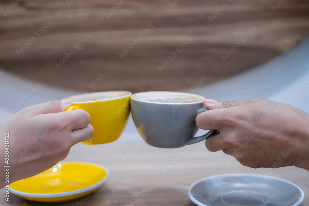 Close-up of a man and woman clinking coffee cups while talking at work.