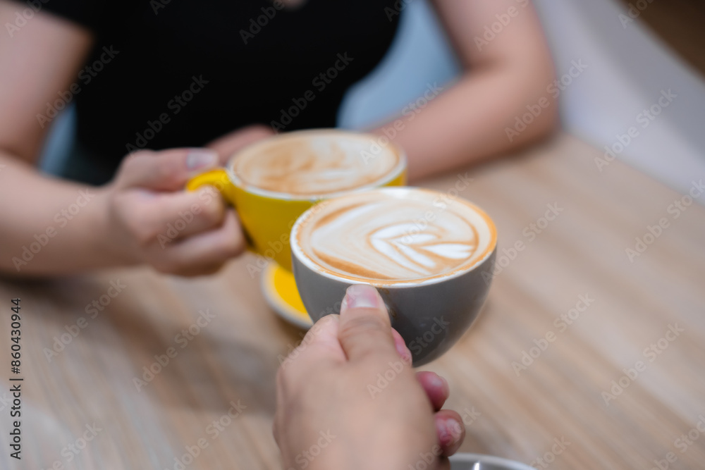 Close-up of a man and woman clinking coffee cups while talking at work.