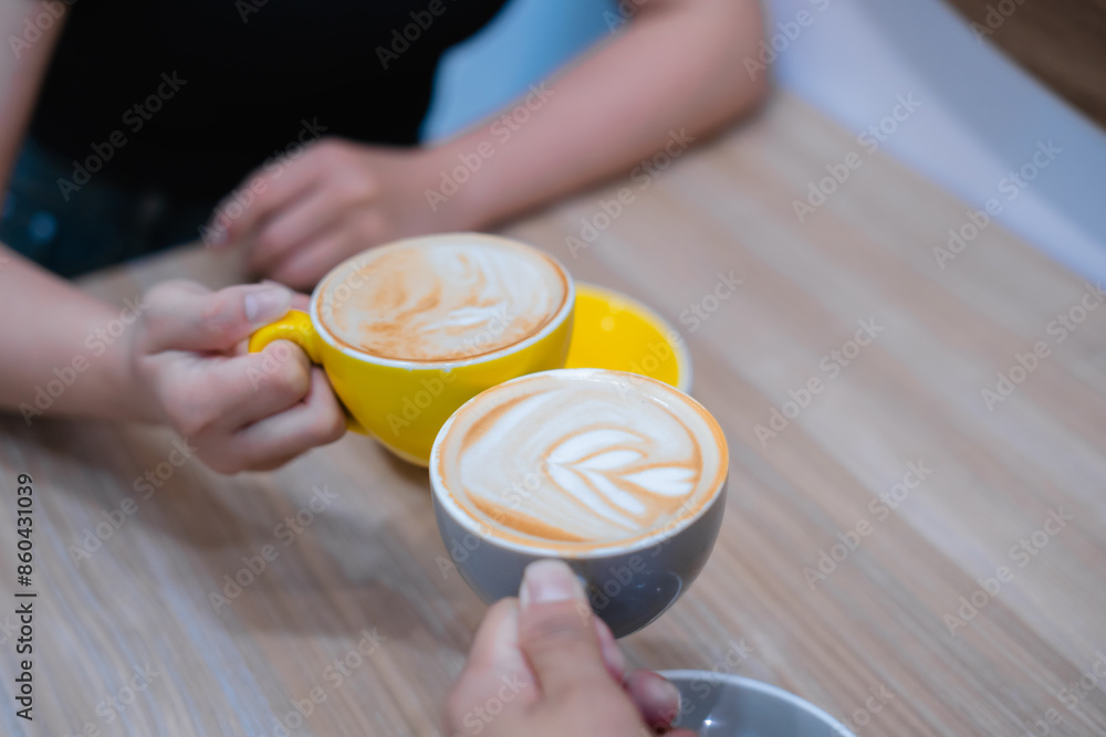 Close-up of a man and woman clinking coffee cups while talking at work.