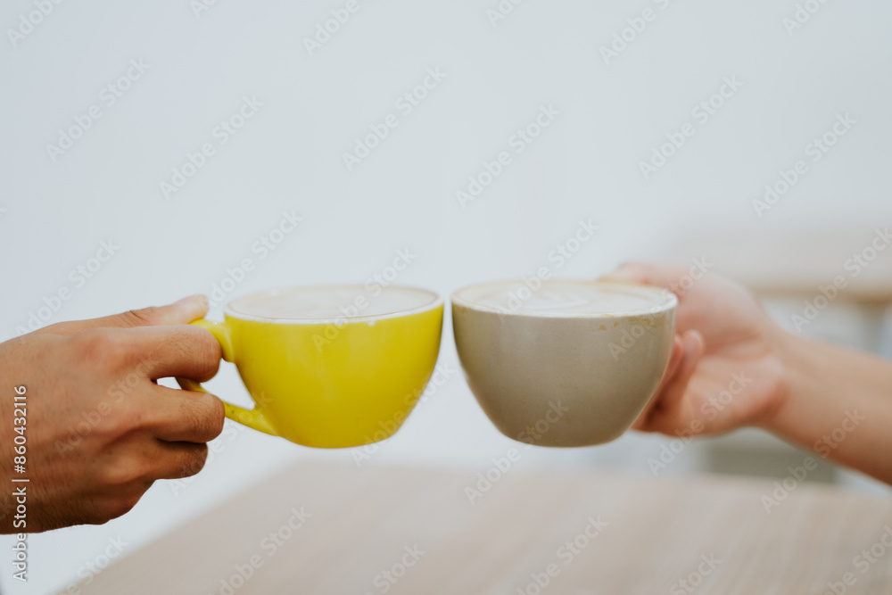 Close-up of a man and woman clinking coffee cups while talking at work.