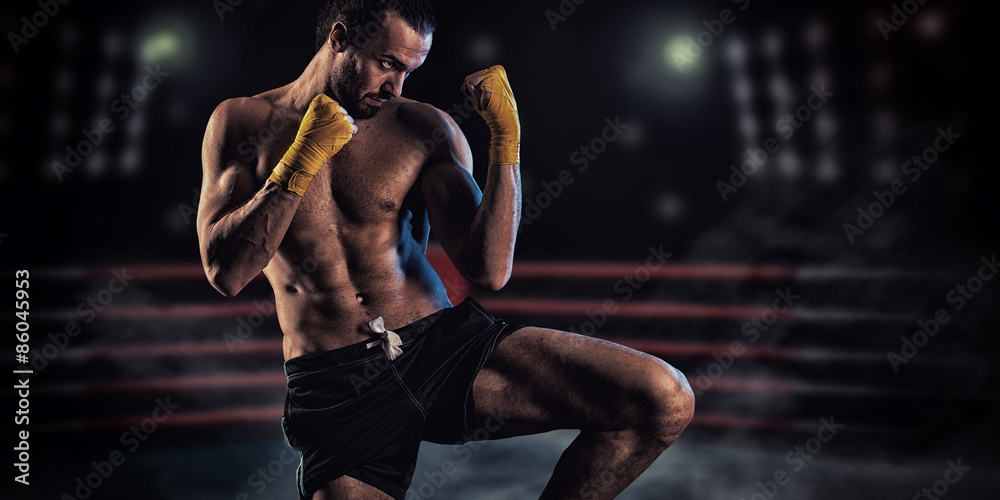 Strong muscular boxer in red boxing gloves. A man in a boxing