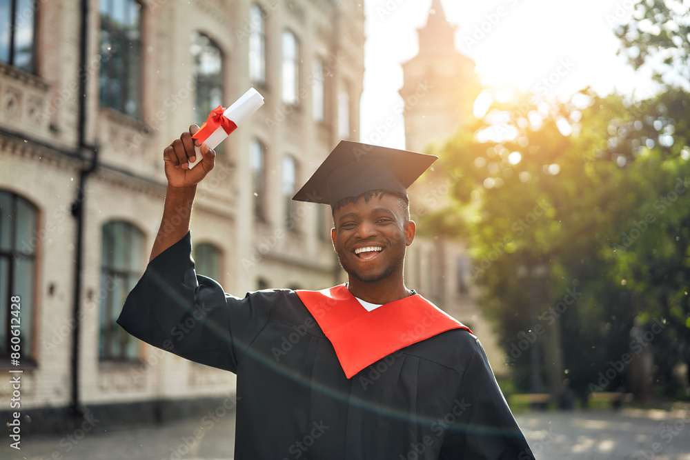 A male graduate is celebrating his academic achievement with a diploma outdoors on a sunny day
