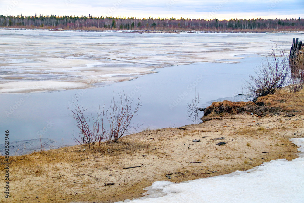 Spring flood, river with remnants of ice, melting ice, landscape river ice spring, thawed dangerous ice.
