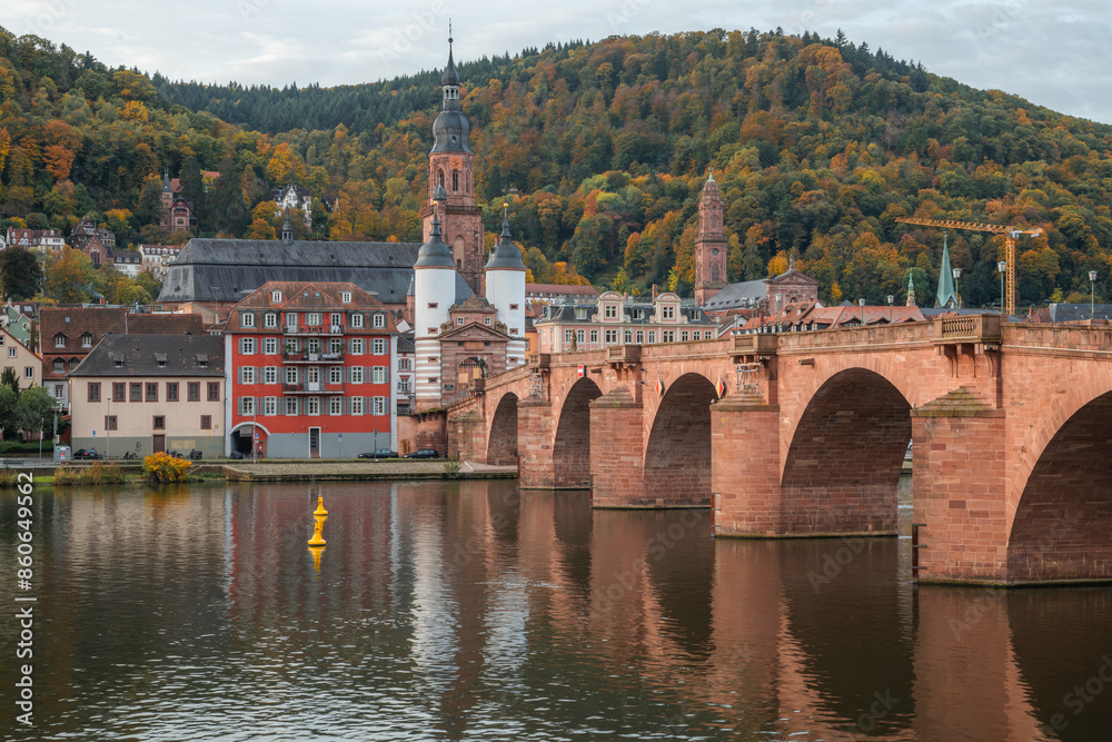 View on the Karl Theodor Bridge (German: Karl-Theodor-Brücke) and the old gate in the german city Heidelberg during early morning on a cloudy day. Heidelberg on Neckar river.