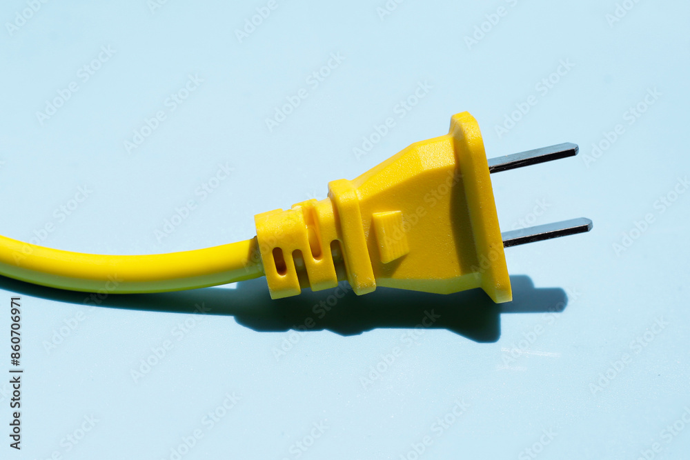 Yellow electric power cable with plug on blue background.