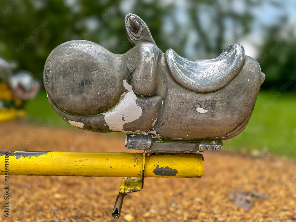 Old, retro, used weathered metal park playground spring rocker, rocking, equipment.