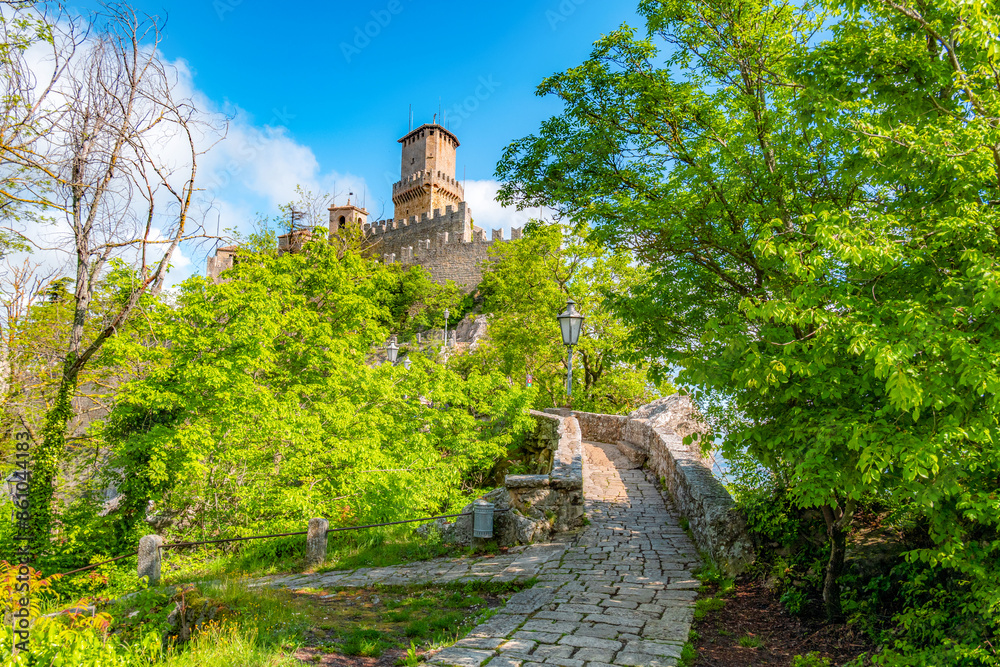 San Marino city view. Fortress on the rock. San Marino landmark. Italy.