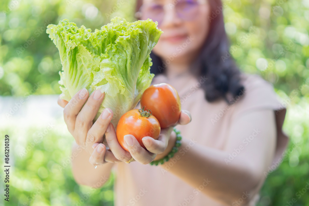 Happy Asian senior woman's holds harvest of fresh vegetables in her garden. Organic food concept.
