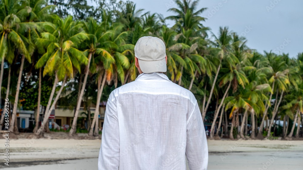 man in a white shirt on the ocean beach overlooking palm trees. view from the back