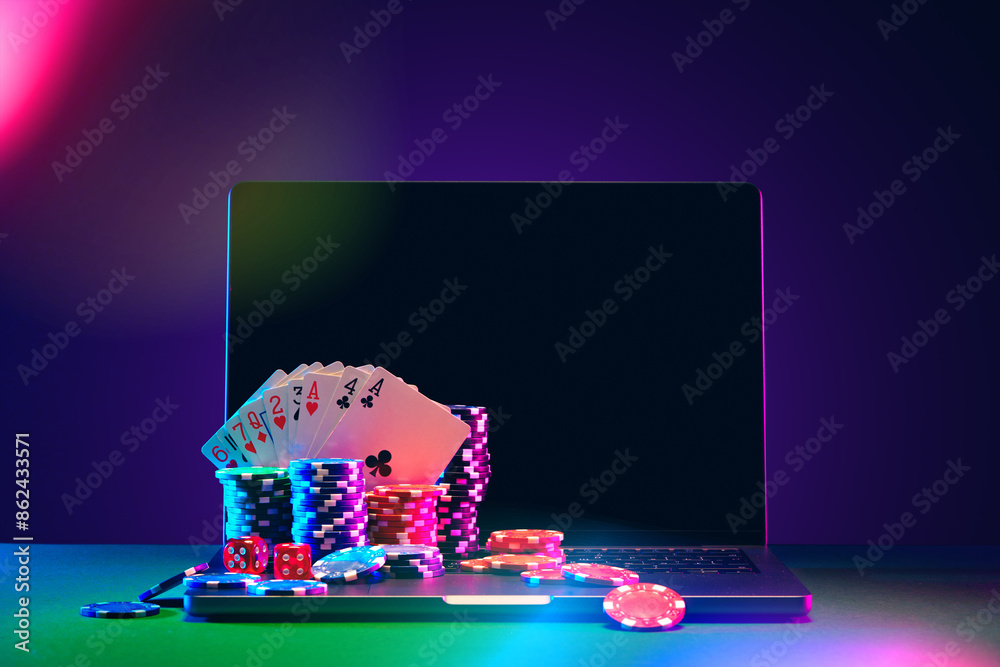 Laptop With Playing Cards and Poker Chips on a Green Table
