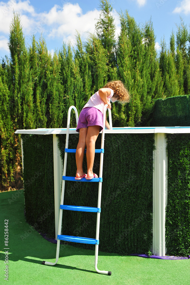 Niña rubia asomada a la piscina desmontable en la casa de campo