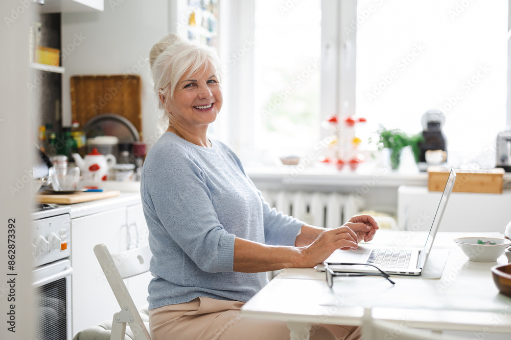 Senior woman with laptop and notebook sitting at the table in the kitchen