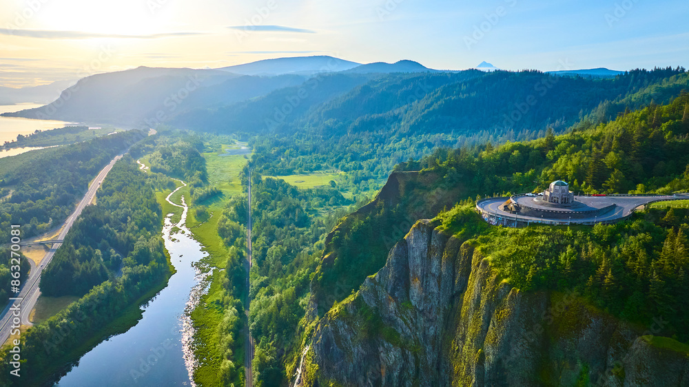 Aerial View of Vista House, River Valley, and Mountainous Landscape
