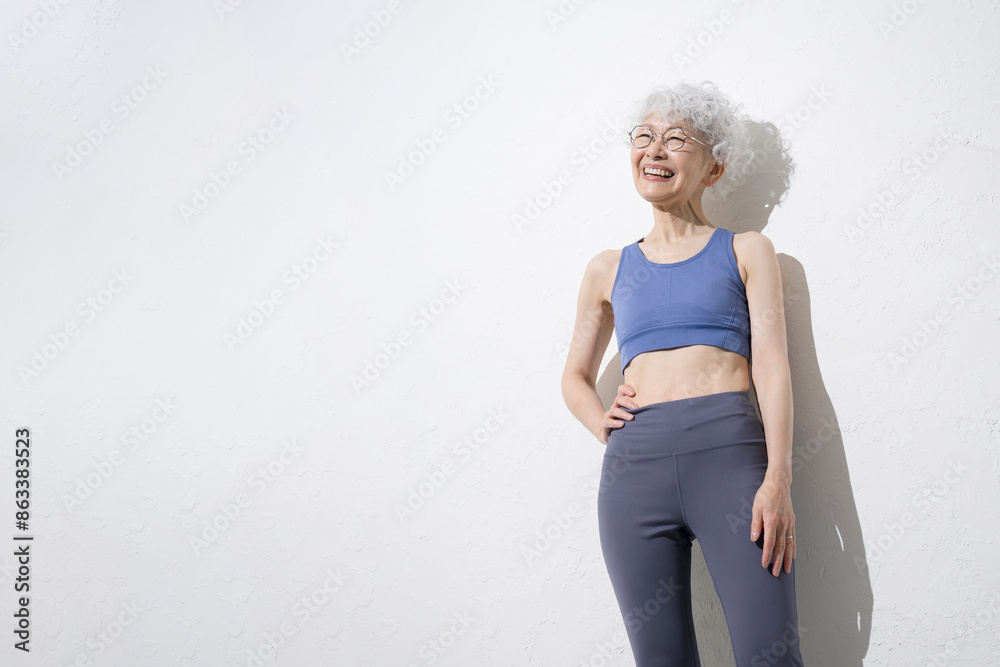 スポーツや運動、健康維持で使いやすい元気なアクティブシニア(高齢者)のポーズ 背景白見上げる