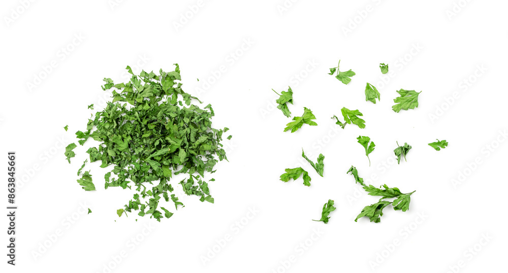 Dry parsley pile isolated. Crushed cilantro leaves heap, dried garden parsley, chervil flakes, corriender pileces