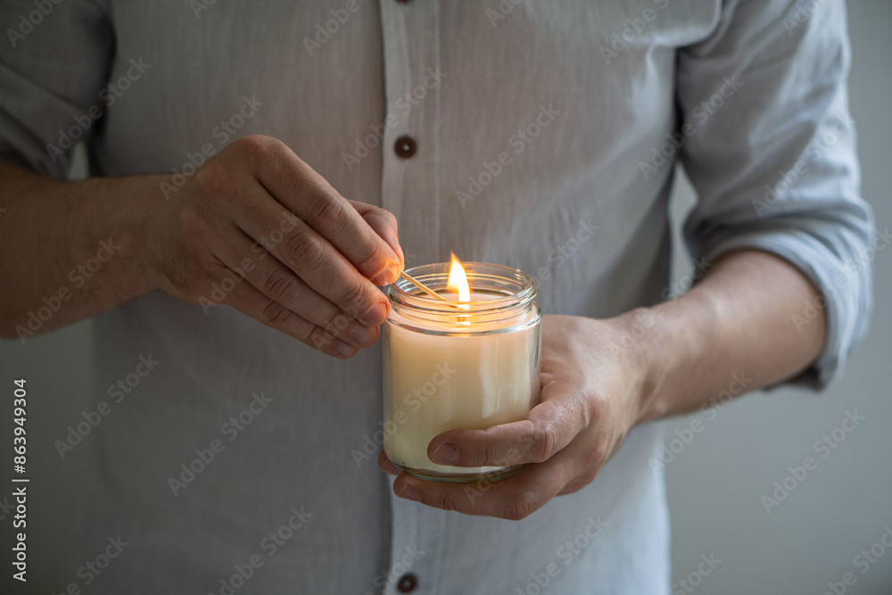 Man holding a burning candle in his hands, elegant young man with candle jar, meditation and mindfulness concept