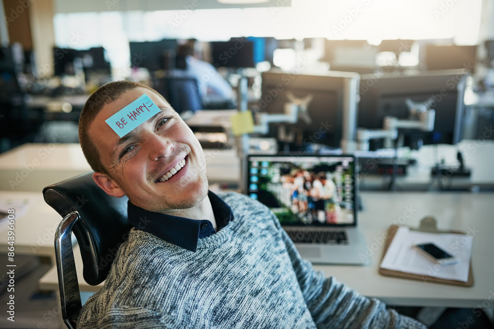 Businessman, portrait and note on forehead in office for happy reminder, work break and comedy prank by desk. Employee, guy smile and paper on face with workplace humor, funny joke and April Fools