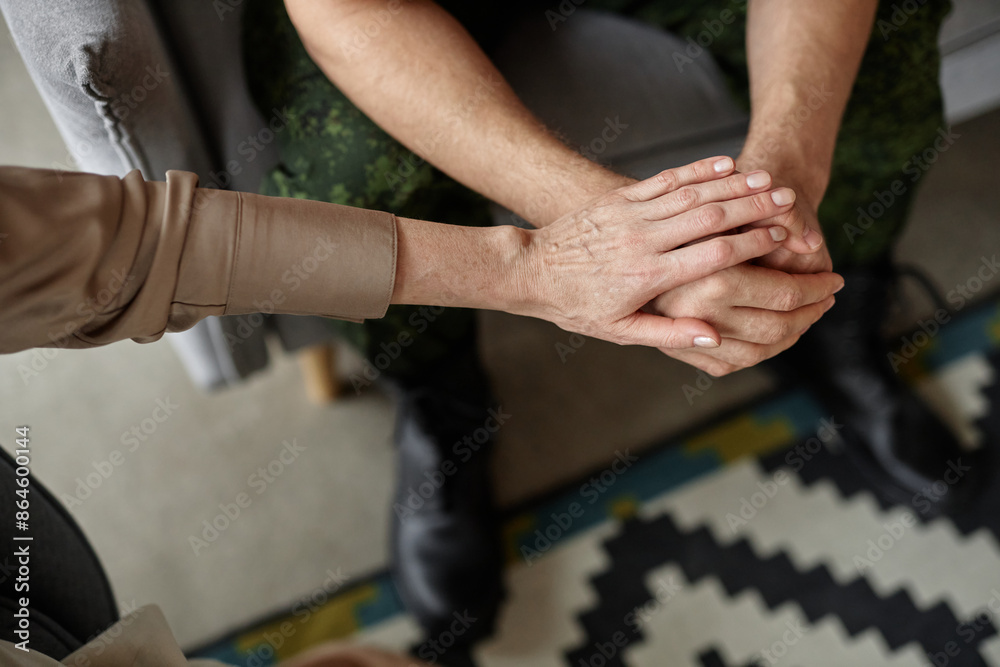 Top view of unrecognizable female psychologist holding hands with army veteran in therapy session copy space