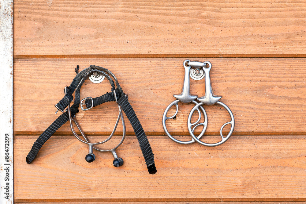 Steel horse snaffle-bit and spurs hanging on wooden background