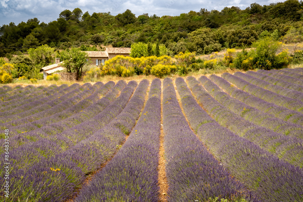 Cultivation of lavender in the Luberon, Provence, France. Landscape panorama with long rows of lavender. At the end of the row some broom bushes, a farmhouse and forest