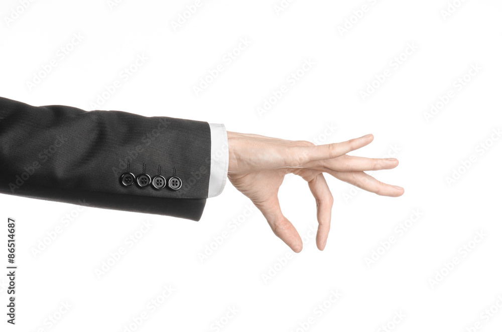 Businessman and gesture topic: a man in a black suit and white shirt showing hand gesture on an isolated white background in studio
