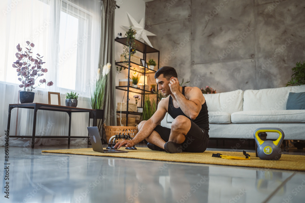 Young man with earphones take a break from training and use laptop