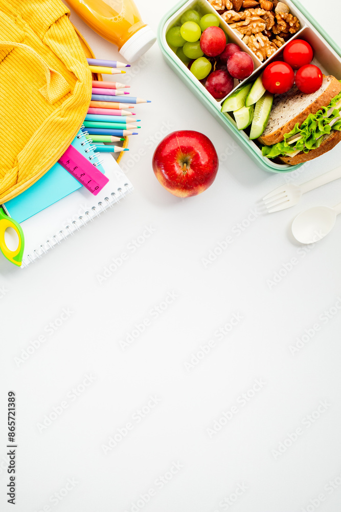 Flat lay school lunch with colorful school supplies, perfect for educational themes and healthy lifestyle promotions.