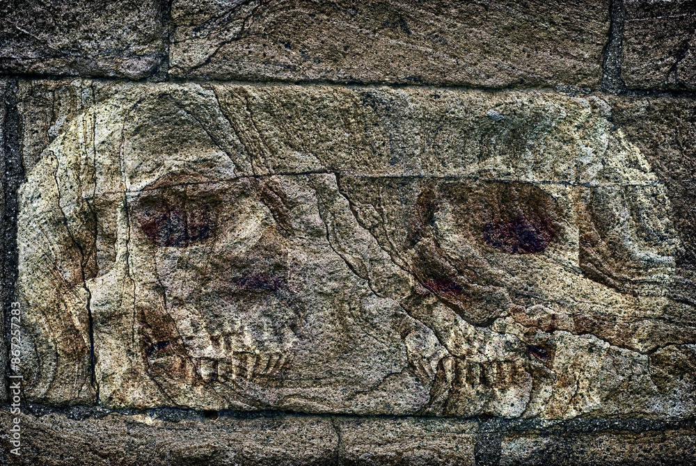 deux cranes humains incrustés dans un mur