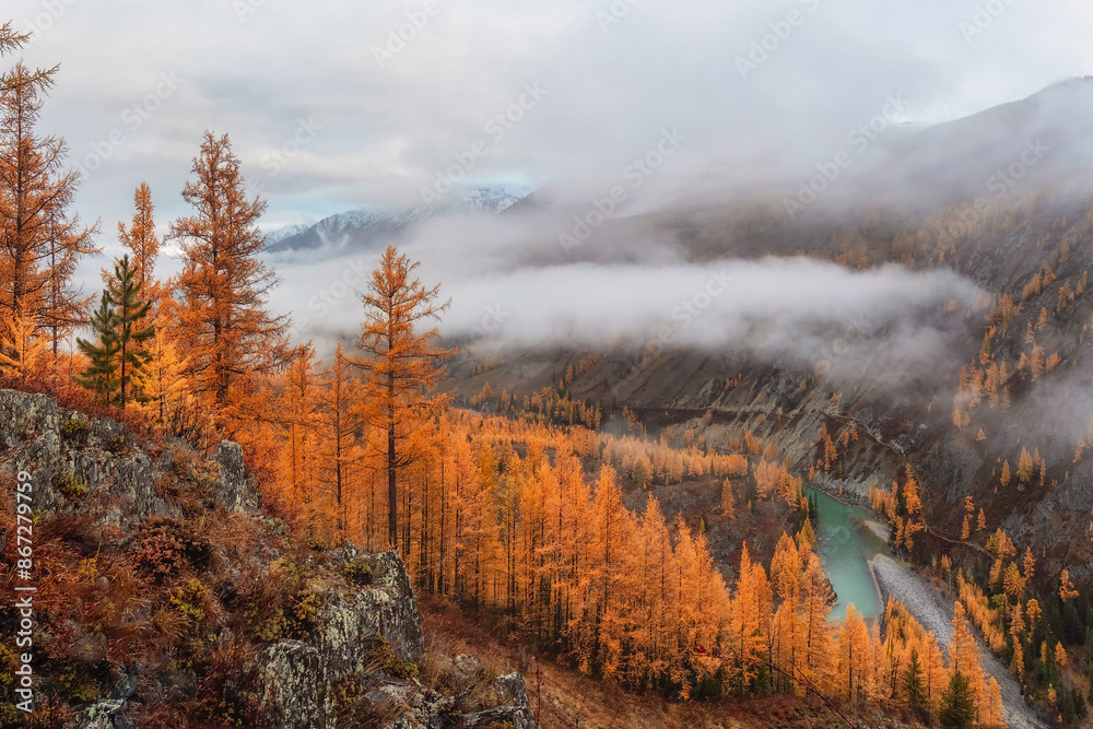 autumn mountains with mystical trees, river in gorge with yellow trees