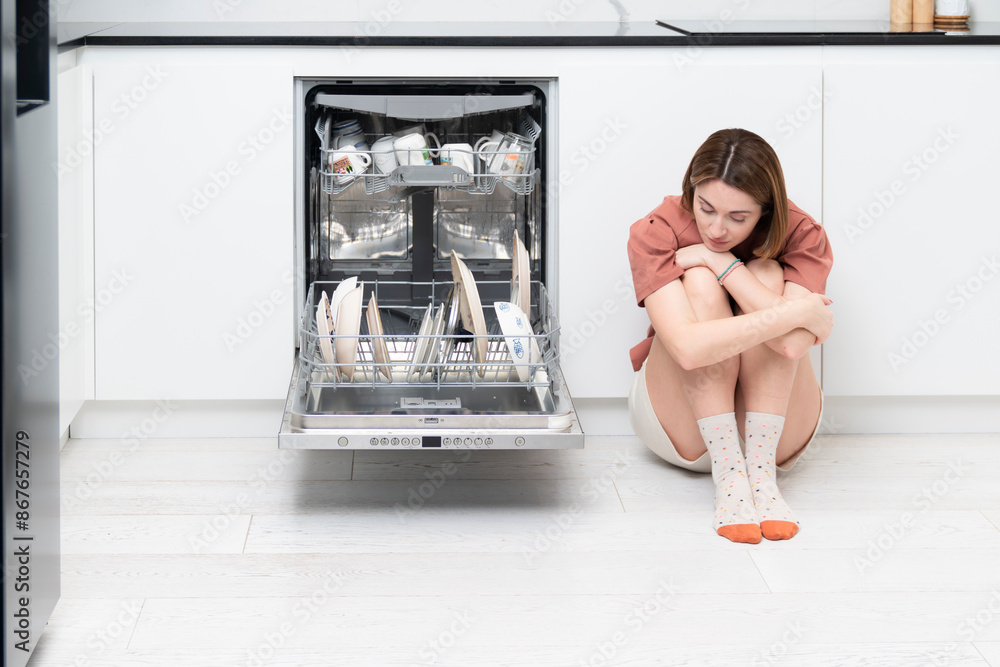 Tired and bored woman putting dirty plates in dishwasher machine in the kitchen. Household and exhausting cleaning day concept