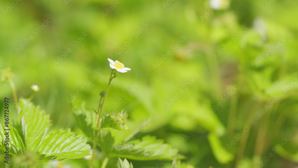 White and yellow flowers on green unripe strawberry plants. Strawberry bushes in garden. Close up.