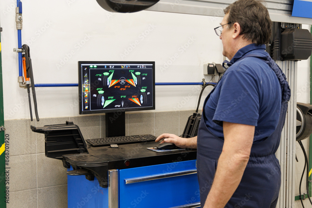 An adult professional mechanic makes the collapse of the convergence of the wheels of a passenger car in the auto repair shop