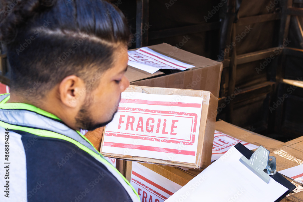 Latino man checks parcels at the shipping destination logistics center and loads them onto a motorized tricycle or tuk-tuk for distribution