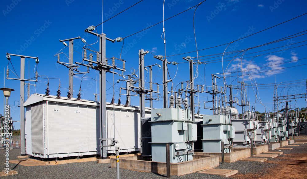 Electrical substations, Pylons and wires distribute power through high-voltage transmission lines. Blue Sky. Queensland, Australia.