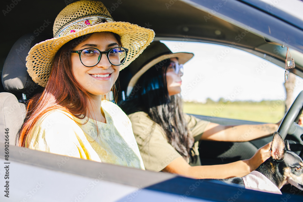 Latin women travel by car to enjoy a beautiful afternoon with friends; Both are wearing hats, and one of them looks at the camera with an expression of freedom and enjoyment