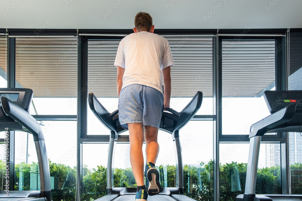 Rear view of man doing cardio training in fitness studio in residental building. Male warming up for sport training and walking on treadmill in modern gym. Fitness, wellness, healthy lifestyle