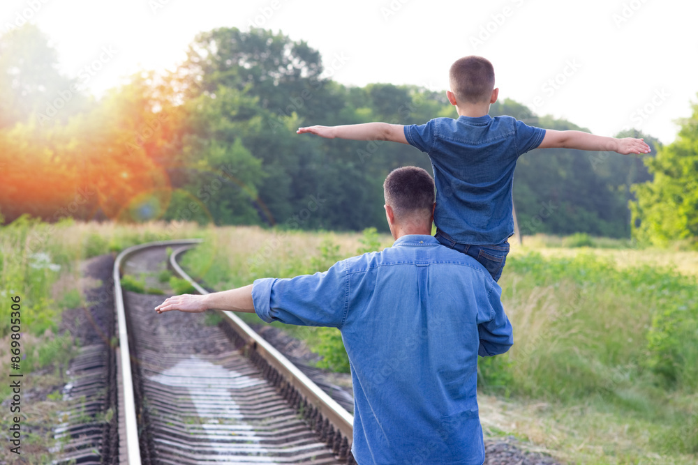A Happy child on the shoulders of a parent in nature on the way to travel